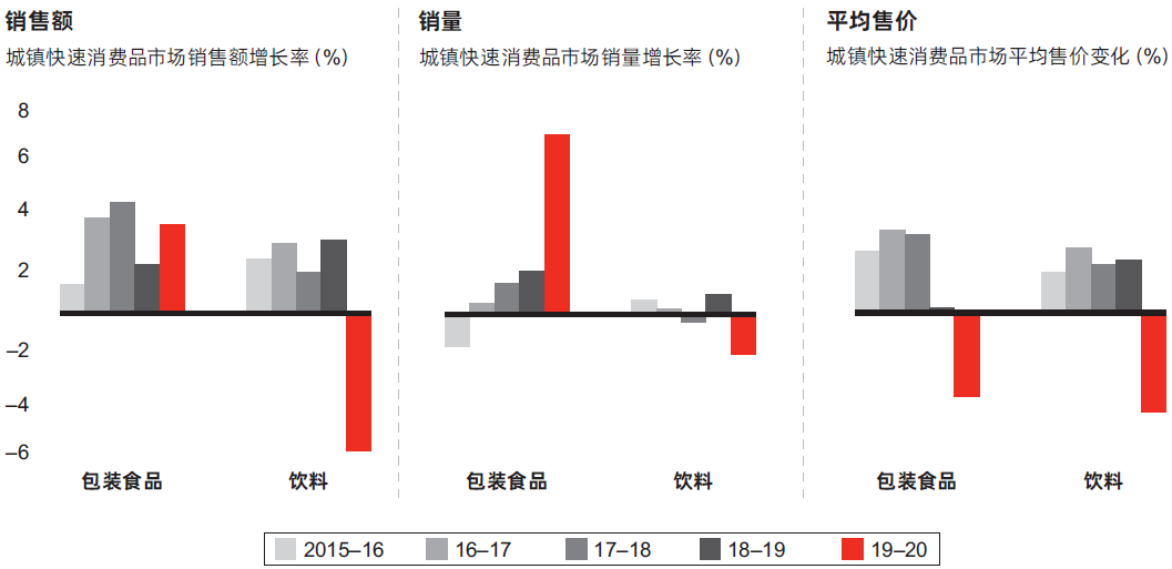 除此之外,报告还研究了各品类之间的差异化表现。例如,平均售价均有所下降的包装食品(-3.4%)和饮料品类(-4.1%)在销量方面的表现大不相同。由于消费者在封城期间和初步恢复阶段大量囤积方便面、冷冻食品和其它主食类产品,包装食品的销量增长7.2%,是2019年同期的三倍有余。而饮料品类则由于社交消费场景的减少,销量下降了1.6%。
